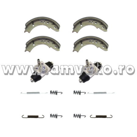 Kitul include toate componentele necesare pentru întreținerea completă a sistemului de frânare: 4 saboți de frână, 2 cilindri de frână, 2 arcuri inferioare, 2 arcuri superioare și 4 arcuri de fixare saboți.